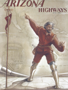 The text celebrates Arizona's rich history and diverse attractions. It honors both the early Spanish explorers, like Coronado, and the modern adventurers who travel its highways, inviting readers to discover the state's unique blend of past and present.