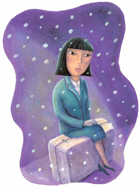 And then I saw her. She had turned her suitcase on its edge to provide herself a seat. There she sat, completely detached from her bleak surroundings, one gloved palm resting in the other, silken ankles crossed, smooth black hair daring the chill wind to disturb it. Dim lights outlined her beautiful, trim little body in its exquisitely fitted blue suit, matching shoes on her tiny feet.