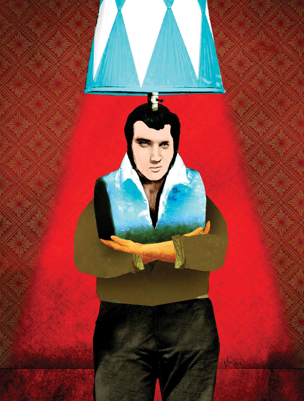 The collar of his rhinestone-studded jumpsuit is turned up high and open at the throat. A blue scarf dangles seductively. His hair is impossibly black, swept back and big, marred only by the bulb and shade protruding from the top of his head, throwing off a hunka-hunka burning light.
