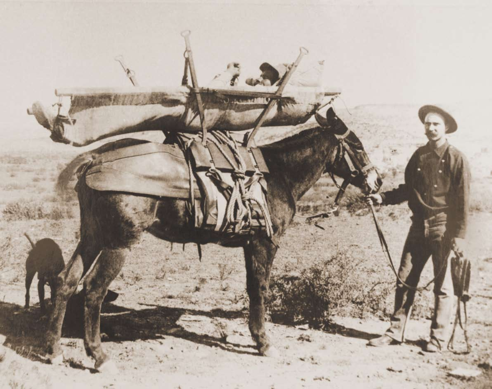 BELIEVE IT OR NOT, this contraption, known as a mule litter, was a prefabricated, government-issued conveyance copied from the French cacolet during the Civil War for transporting wounded soldiers from the battlefield. If you think it looks impractical and ungainly, well, it was. But the surgeon general's office purchased hundreds of them and Assistant Surgeon Edgar Mearns, a post physician at Fort Verde from 1884 to 1888, documented the elevated stretcher's use (at least once). Though a vast improvement over a bone-jarring trip in a travois (a sling between two poles dragged behind a horse), the mule litter required specially trained mules and was no joy ride, and definitely not for the acrophobic.