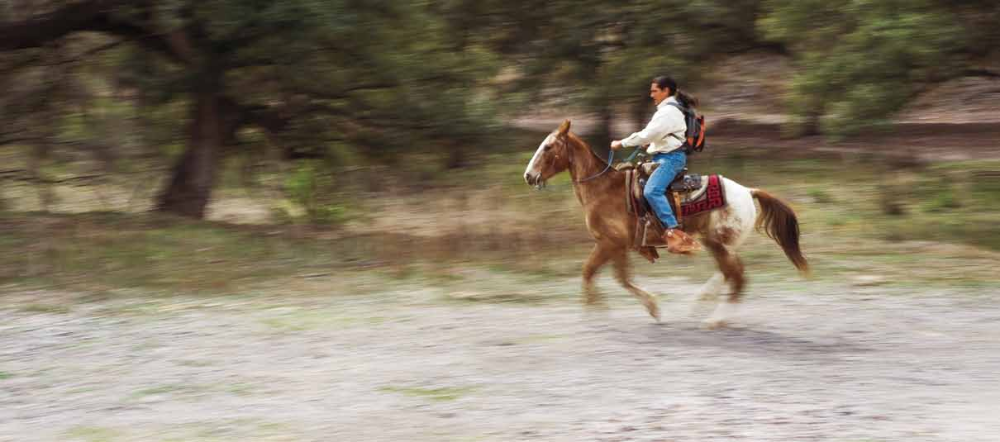 THE HORSES ARE REFRESHED and the riding party remounts. The peaks of Arizona disappear as the equestrians descend into a rocky canyon in Roberto Corella's Rancho La Esmeralda.