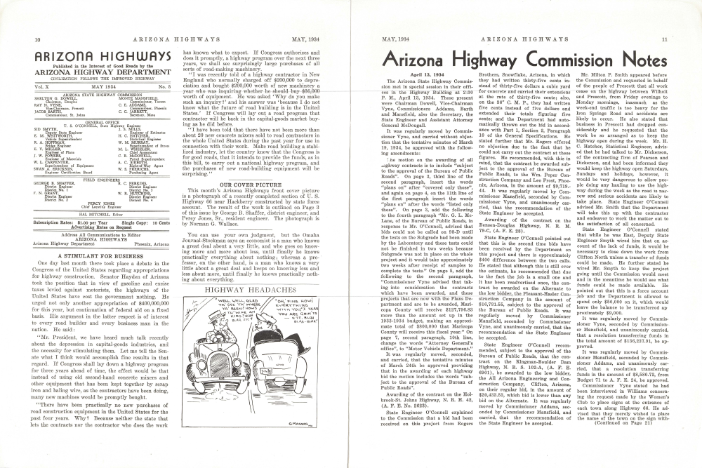 This month's Arizona Highways front cover picture is a photograph of a recently completed section of U. S. Highway 66 near Hackberry constructed by state force account. The result of the work is outlined on Page 3 of this issue by George B. Shaffer, district engineer, and Percy Jones, Sr., resident engineer. The photograph is by Norman G. Wallace.