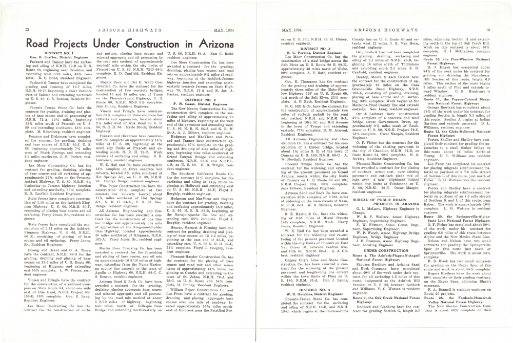 W. R. Hutchins, District Engineer Phoenix-Tempe Stone Co. has completed the contract for the surfacing and oiling of N.R.H. 18-B, and N.R.H. 18-C, which begins at the Cochise-Pima Orr, Rawls & Lashmet have completed the grading, draining, surfacing and oiling of 2.1 miles of N.R.H. 79-B, beginning 16 miles south of Tombstone and extending south 2.1 miles. R. D. Canfield, resident engineer.