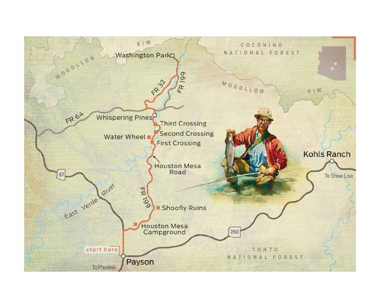 Note: Mileages are approximate. LENGTH: 14.7 miles one way DIRECTIONS: From Payson, drive north on State Route 87 for 2 miles and turn right onto Houston Mesa Road. VEHICLE REQUIREMENTS: None TRAVEL ADVISORY: There is a $6 parking fee at river crossings; self-pay kiosks are found in the parking lots. WARNING: Back-road travel can be hazardous, so be aware of weather and road conditions. Carry plenty of water. Don't travel alone, and let someone know where you are going and when you plan to return. INFORMATION: Payson Ranger District, 928-474-7900 or www.fs.usda.gov/tonto