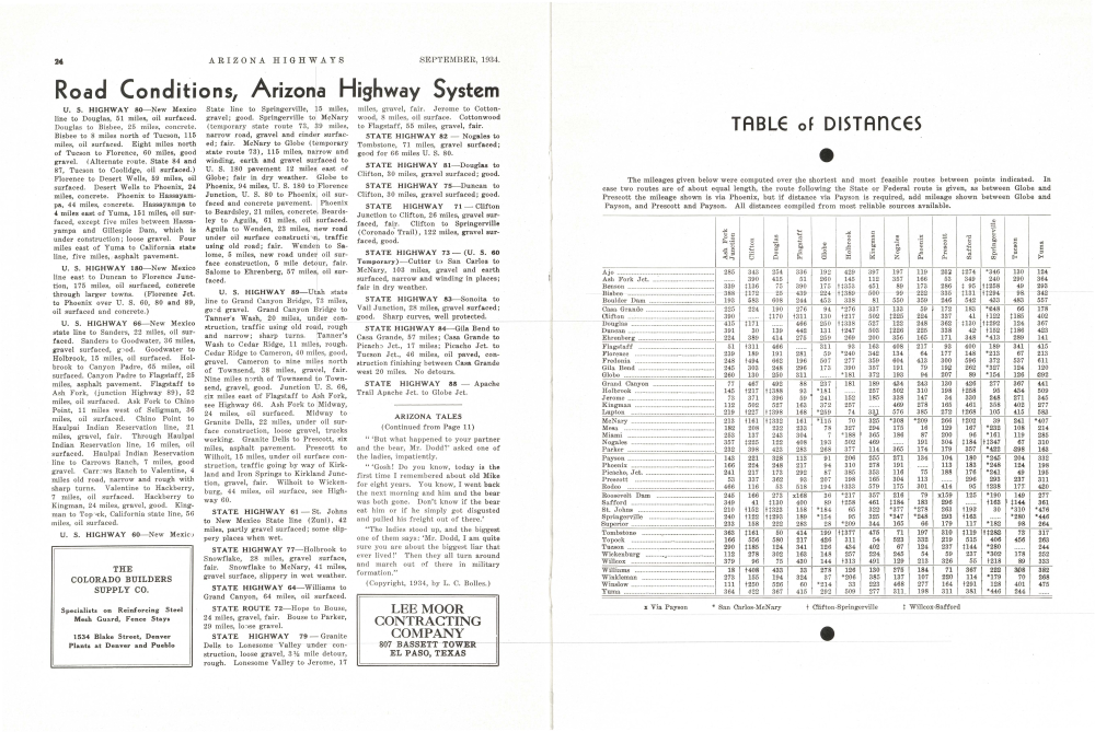 U. S. HIGHWAY 60-New Mexico State line to Springerville, 15 miles, gravel; good. Springerville to McNary (temporary state route 73, 39 miles, narrow road, gravel and cinder surfaced; fair. MeNary to Globe (temporary state route 73), 115 miles, narrow and winding, earth and gravel surfaced to U. S. 180 pavement 12 miles east of Globe; fair in dry weather. Globe to Phoenix, 94 miles, U. S. 180 to Florence Junction, U. S. 80 to Phoenix, oil surfaced and concrete pavement. Phoenix to Beardsley, 21 miles, concrete. Beardsley to Aguila, 61 miles, oil surfaced. Aguila to Wenden, 23 miles, new road under oil surface construction, traffic using old road; fair. Wenden to Salome, 5 miles, new road under oil surface construction, 5 mile detour, fair. Salome to Ehrenberg, 57 miles, oil surfaced.