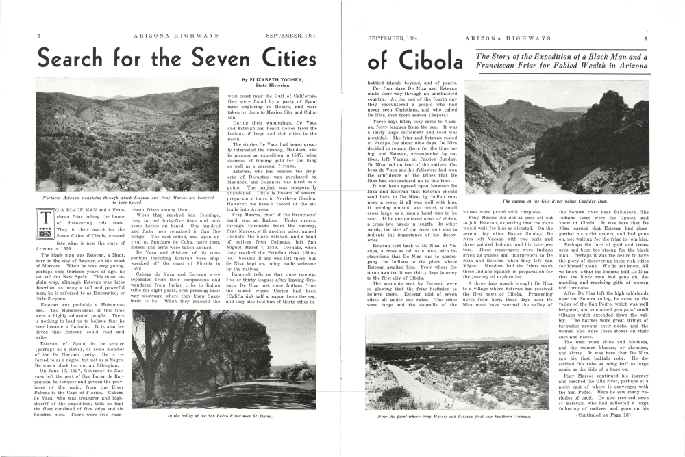 SEPTEMBER, 1934. of Cibola ARIZONA HIGHWAYS 9 The Story of the Expedition of a Black Man and a Franciscan Friar for Fabled Wealth in Arizona