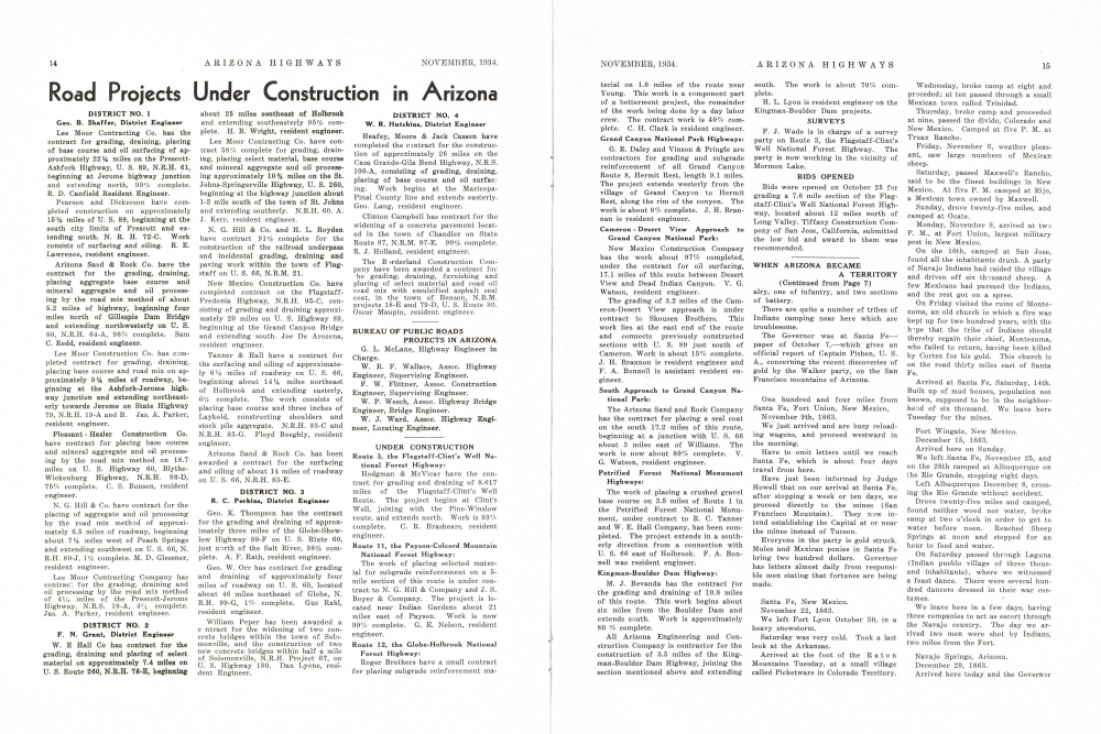 Route 12, the Globe-Holbrook National Forest Highway: Roger Brothers have a small contract for placing subgrade reinforcement ma-has issued his proclamation. This is the first point which we know to be in Arizona Territory.