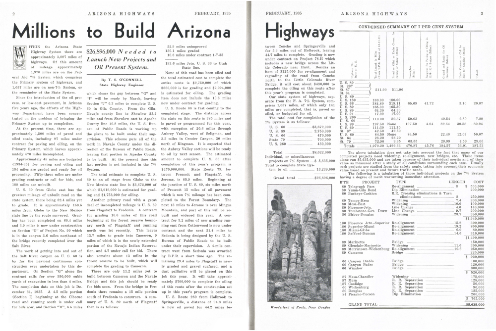 U. S. Route 66 is fast coming to the completed stage. The distance across the state on this route is 385 miles and is paved or programmed for this year, with exception of 20.6 miles through Aubrey Valley, west of Seligman, and 3.5 miles in Crozier Canyon, 30 miles north of Kingman. It is expected that the Aubrey Valley sections will be ready to oil by next season. The estimated amount to complete U. S. 66 after completion of this year's program is $470,000,000. State Route 79, be-tween Prescott and Flagstaff, via Jerome, is 85.9 miles. Beginning at the junction of U. S. 89, six miles north of Prescott 15 miles of oil pavement which is non 7% mileage has been com-pleted to the Forest Boundary. The next 13 miles to Jerome is over Mingus Mountain, and part of this will be re-built and widened this year. A con-tract for 3.2 miles of new grading run-ning east from Cottonwood is now under contract and the next 21.4 miles to Sedonia is being designed by the U. S. Bureau of Public Roads to be built under their supervision. A 4-mile con-tract west from Sedonia was awarded by B.P.R. a short time ago. The re-maining 29.4 miles to Flagstaff is new-ly graded and gravel surfaced, and a dust palliative will be placed on this job this year. It will take approxi-mately $700,000 to complete the oiling of this route after the construction set up in this year's program is complete. U. S. Route 260 from Holbrook to Springerville, a distance of 94.8 miles is now oil paved for 44.2 miles be-