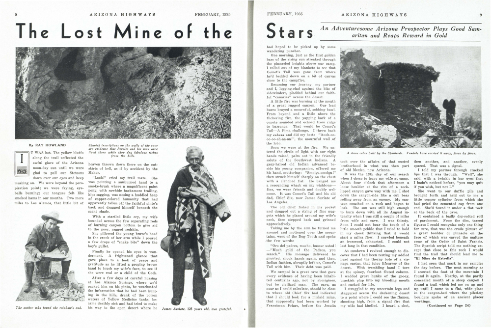 FEBRUARY, 1935 ARIZONA HIGHWAYS 9 Stars An Adventuresome Arizona Prospector Plays Good Samaritan and Reaps Reward in Gold