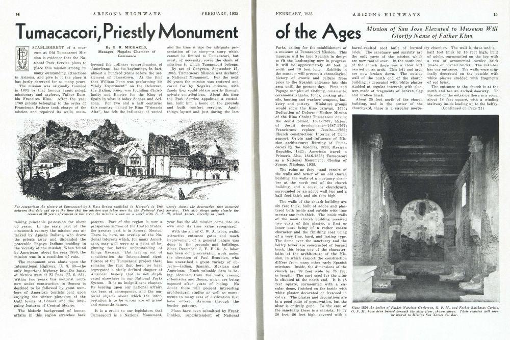 ESTABLISHMENT of a museum at Old Tumacacori Mission is evidence that the National Park Service plans toplace this mission among itsmany outstanding attractionsin Arizona, and give to it the place ithas justly deserved for so many years.