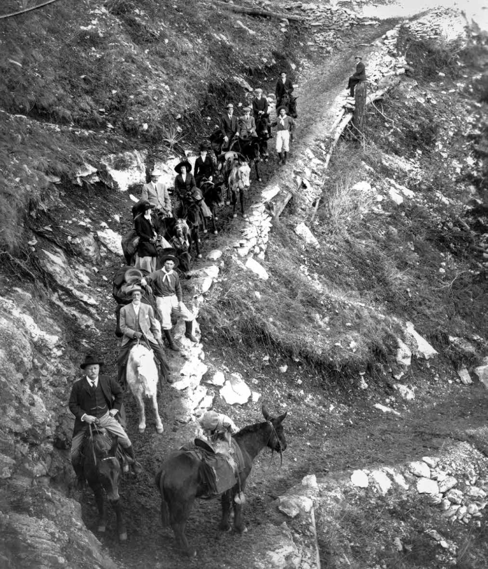 Former President Theodore Roosevelt leads a party down the Grand Canyon’s Bright Angel Trail in March 1911. Three years earlier, Roosevelt had designated the Canyon a national monument; it became a national park in 1919. “In the Grand Canyon,” he said, “Arizona has a natural wonder which is in kind absolutely unparalleled throughout the rest of the world. I want to ask you to keep this great wonder of nature as it now is. I hope you will not have a building of any kind, not a summer cottage, a hotel or anything else, to mar the wonderful grandeur, the sublimity, the great loneliness and beauty of the Canyon. Leave it as it is. You cannot improve on it. The ages have been at work on it, and man can only mar it.” Behind Roosevelt is John Hance, who may have been the Canyon’s first non-Native American resident. The Kolb brothers, who operated a photography studio on the Canyon’s South Rim for decades, made the photo.