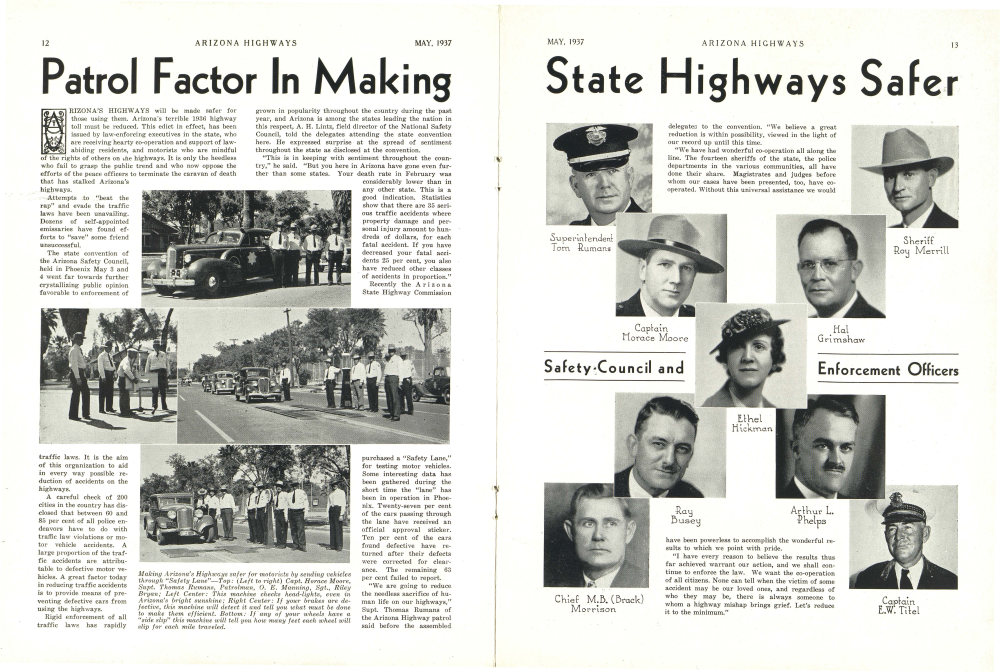 ARIZONA'S HIGHWAYS will be made safer for those using them. Arizona's terrible 1936 highway toll must be reduced. This edict in effect, has been issued by law-enforcing executives in the state, who are receiving hearty co-operation and support of lawabiding residents, and motorists who are mindful of the rights of others on the highways. It is only the heedless who fail to grasp the public trend and who now oppose the efforts of the peace officers to terminate the caravan of death that has stalked Arizona's highways. Attempts to "beat the rap" and evade the traffic laws have been unavailing. Dozens of self-appointed emissaries have found efforts to "save" some friend unsuccessful. The state convention of the Arizona Safety Council, held in Phoenix May 3 and 4 went far towards further crystallizing public opinion favorable to enforcement of traffic laws. It is the aim of this organization to aid in every way possible reduction of accidents on the highways. A careful check of 200 cities in the country has disclosed that between 60 and 85 per cent of all police endeavors have to do with traffic law violations or motor vehicle accidents. A large proportion of the traffic accidents are attributable to defective motor vehicles. A great factor today in reducing traffic accidents is to provide means of preventing defective cars from using the highways. Rigid enforcement of all traffic laws has rapidly purchased a "Safety Lane," for testing motor vehicles. Some interesting data has been gathered during the short time the "lane" has been in operation in Phoenix. Twenty-seven per cent of the cars passing through the lane have received an official approval sticker. Ten per cent of the cars found defective have returned after their defects were corrected for clearance. The remaining 63 per cent failed to report. "We are going to reduce the needless sacrifice of human life on our highways," Supt. Thomas Rumans of the Arizona Highway patrol said before the assembled delegates to the convention. "We believe a great reduction is within possibility, viewed in the light of our record up until this time."