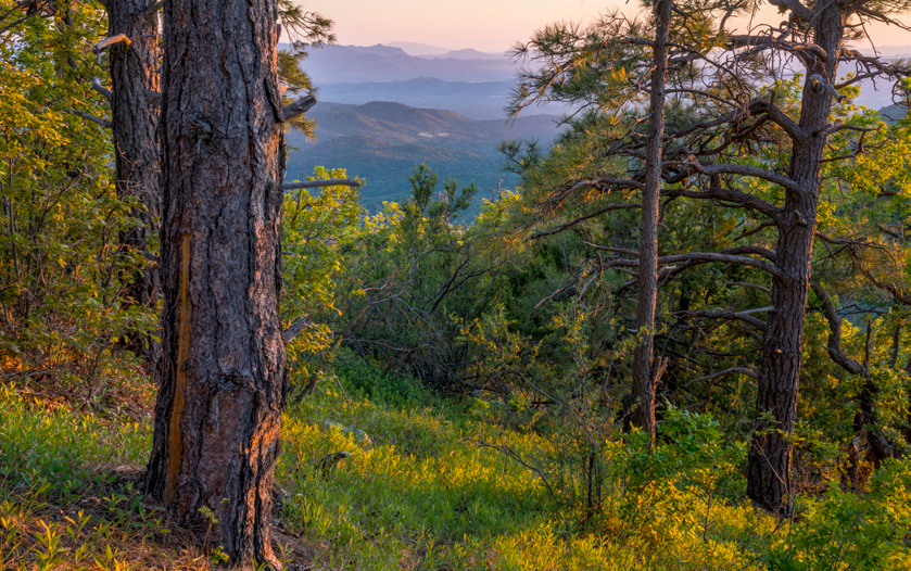 Don't let the name fool you. It's deceiving. There is a mountain, and it's the focus of the hike, but what happens between the trailhead and the top is very different from what you'll experience on Humphreys Peak, Mount Baldy or Granite Mountain. With those, and with most other mountain hikes, there's an understanding that you'll huff and puff on the way up - a gradual ascent to the summit and then coast back down. That's not what happens on the West Spruce Mountain Trail. Like the lines on an echocardiogram, the slope of this route is up and down. Up and down, up and down, up and down. The deceit is in the numbers. On paper, the elevation gain from the trailhead to the top is only 344 feet. That's not so bad, you'll think. However, with all the ascending and descending, you'll actually climb more than a thou-sand feet on the way up. Then, on the way "down," you'll get to do it all over again. From the trailhead, the route begins with a slight climb on a rocky track. Almost immediately, you'll start seeing alligator junipers, which punctuate the landscape with their ancient wisdom. At first, they're small, but they get bigger as you go. And as you go, you'll follow a well-maintained barbed-wire fence that separates hikers from the Copper Basin Wash, a deep ravine to the south that presses against the Sierra Prieta. After about 10 minutes, the first giant juniper shows up. Like most old gators, it's a gnarly specimen with multiple trunks fused together. Because of those many trunks and the tree's ability to produce more than one tree ring annually, it's hard to know exactly how old an alligator juniper is. The oldest confirmed gator is more than 500 years old, but it's possible there are some that are more than a thousand. Whatever its age, this big fella is a beauty. And it LEFT: Ponderosa pine trunks flank a view to the southwest from the West Spruce Mountain Trail.