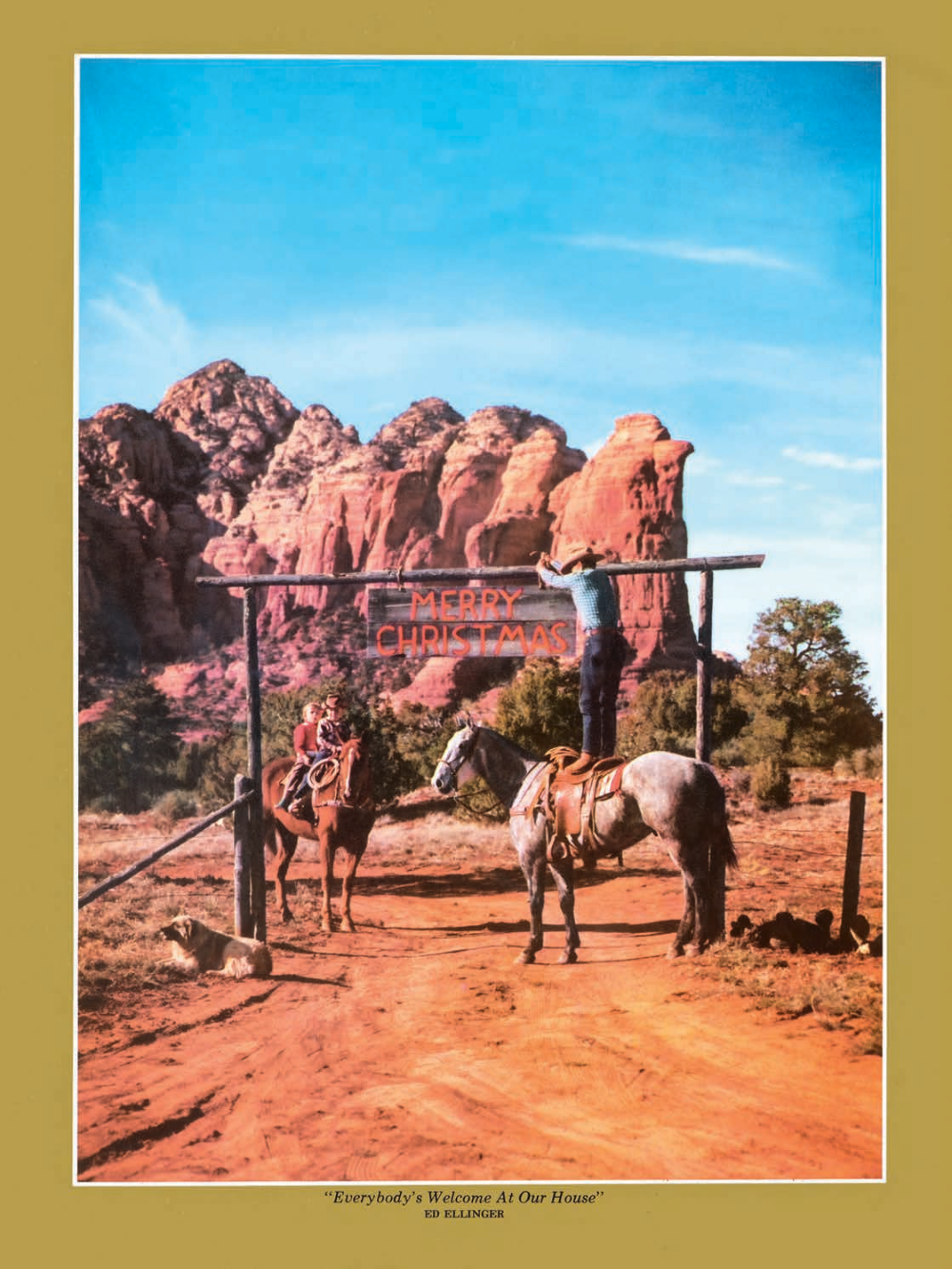Turns out, the man hanging the sign was Hank Burris, a horseman from Sedona. His son, Norman, is sitting on the front of the horse. And behind him is Marquetta Kilgore, a friend of the Burris family. The image was used on the Ellingers’ Christmas card in the late 1950s. Most likely, Arizona Highways would have been on the Ellingers’ Christmas card list — Mr. Ellinger was a contributor — and that’s probably how our editor discovered the photo, which we published on the back cover of our December 1960 issue.