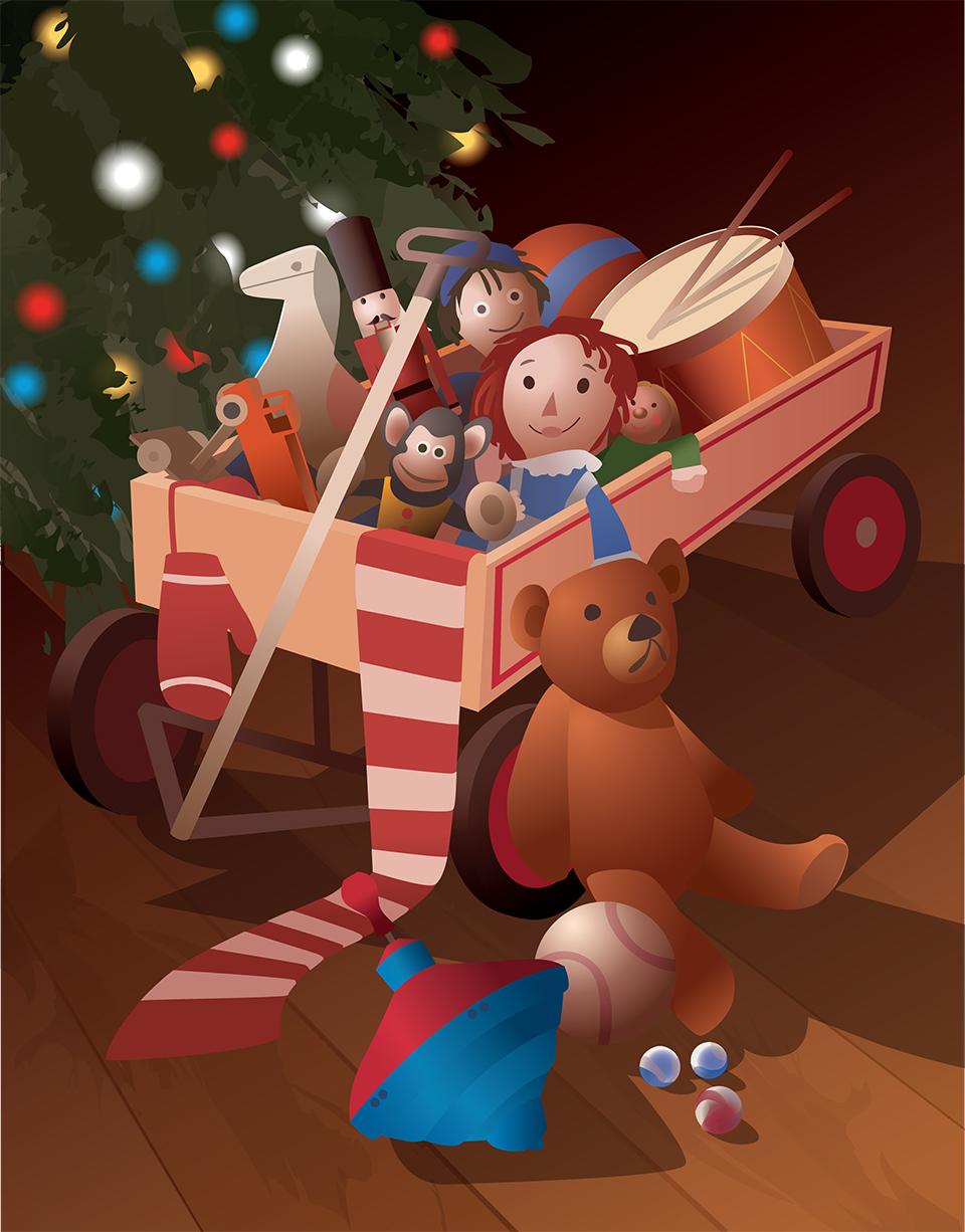 The 30-foot tree would be laden with gifts to be distributed to families in need: “dolls for the little girls; tops, marbles and coaster-wagons for the boys.” For their parents, “warm shoes and wraps.” “Meats and other household necessities” would accompany these gifts, “so that their Christmas tables will be set with all of the delicacies that make a joyous Christmas.”