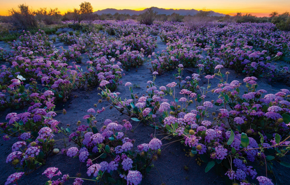 With the Sierra Estrella in the background, blooming sand verbenas carpet the bed of the Gila River at sunset. From its headwaters in New Mexico, the Gila crosses Arizona from east to west before emptying into the Colorado River in Yuma, but some stretches, including this one, are dry for most of the year.