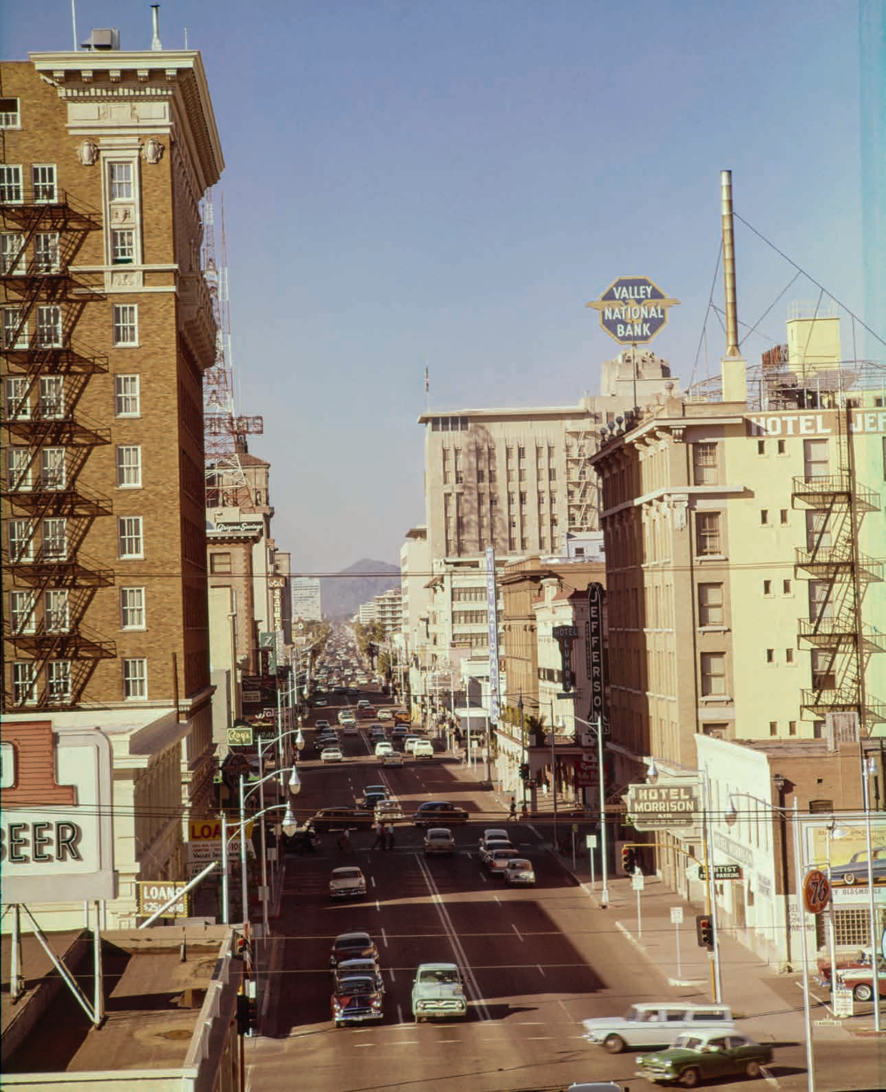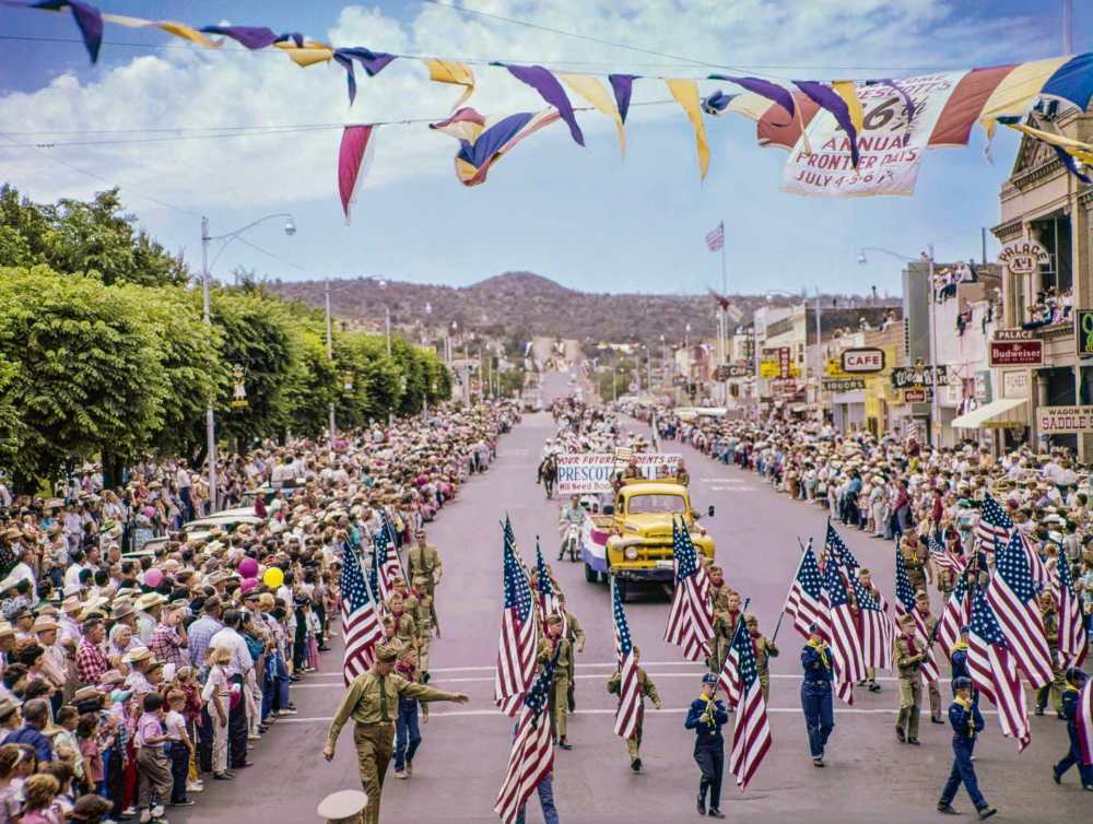 Prescott’s Fourth of July celebrations have always been among the state’s most vibrant, and the 1963 edition was no exception. Here, residents watch the Frontier Days rodeo parade down Montezuma Street; Whiskey Row, including the historic Palace Restaurant and Saloon, is on the right.