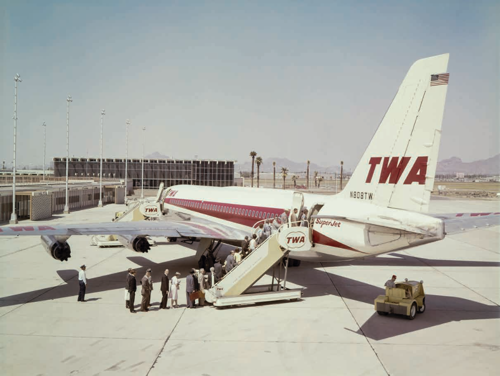 Travelers board a TWA Convair 880 at Sky Harbor Municipal Airport (now Phoenix Sky Harbor International Airport). In the background is the airport’s Terminal 2, which opened in 1962; the same year, Sky Harbor handled more than 1 million passengers for the first time.