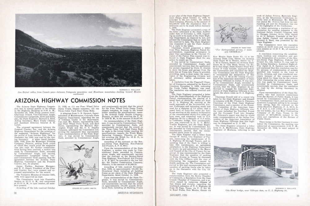 The Arizona State Highway Commission met in special session in its offices in the Highway Building at 9:00 A. M., November 23, 1938. Those present were: Chairman Dowell, Vice-Chairman Angle, Commissioner Langmade, Scott and Seale, also, the State Engineer, Howard S. Reed, Acting Secretary, Mary Foudy Clinton, and Assistant Attorney General A. R. Lynch. The proposed agreement between the Prescott Courier, Inc., and the Arizona Highway Department for the printing of the magazine "Arizona Highways" for the period of from October 24th, 1938, to December 1st, 1940. was read by the Acting Secretary. A letter dated October 24th, 1938, from the Messenger Printing Company, Phoenix, setting forth prices at which they would print the magazine was also read. No further communications having been received, a motion was made by Commissioner Seale, seconded by Commissioner Angle, and carried, Commissioner Langmade voting "no", and Commissioner Scott passing, that the agreement between the Arizona State Highway Commission and the Prescott Courier, Inc., be adopted.
