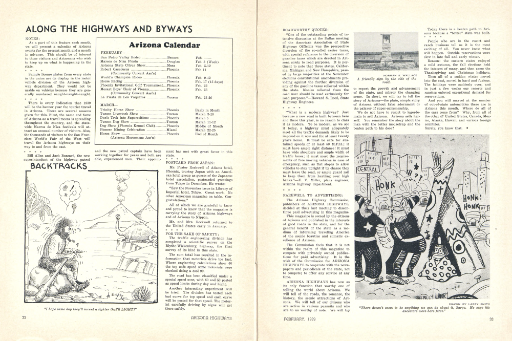 NOTES: As a part of this feature each month, we will present a calendar of Arizona events for the present month and a month in advance. This should be of interest to those visitors and Arizonans who wish to keep up on what is happening in the state. * Sample license plates from every state in the union are on display in the motor vehicle division of the Arizona highway department. They would not be usable on vehicles because they are generally numbered naught-naught-naught. * There is every indication that 1989 will be the banner year for tourist travel in Arizona. There are several reasons given for this. First, the name and fame of Arizona as a travel mecca is spreading throughout the country, and the statewide Marcos de Niza festivals will attract an unusual number of visitors. Also, the thousands of visitors to the San Francisco World's Fair of the West will travel the Arizona highways on their way to and from the east. * Bill Allen and Jack Buzzard, the new superintendent of the highway patrol and the new patrol captain have been working together for years and both are able, experienced men. Their appointment has met with great favor in this state.