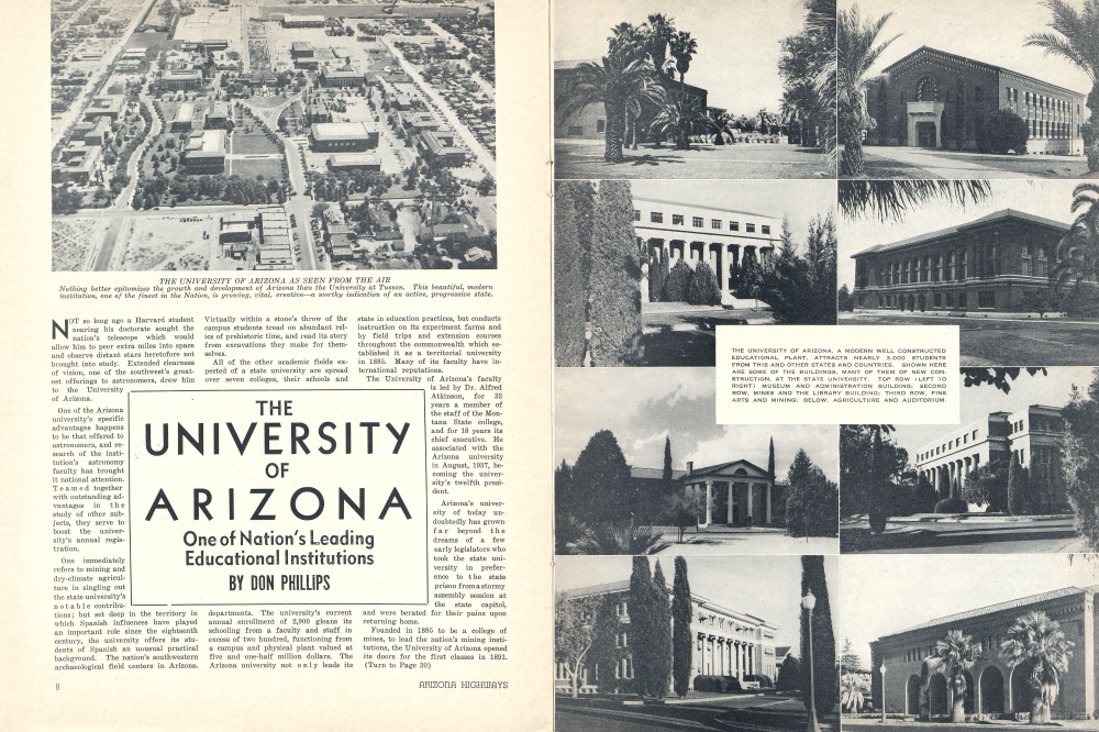 Founded in 1885 to be a college of mines, to lead the nation's mining institutions, the University of Arizona opened its doors for the first classes in 1891. (Turn to Page 30)THE UNIVERSITY OF ARIZONA, A MODERN WELL CONSTRUCTED EDUCATIONAL PLANT, ATTRACTS NEARLY 3,000 STUDENTS FROM THIS AND OTHER STATES AND COUNTRIES. SHOWN HERE ARE SOME OF THE BUILDINGS, MANY OF THEM OF NEW CONSTRUCTION. AT THE STATE UNIVERSITY. TOP ROW (LEFT 10 RIGHT) MUSEUM AND ADMINISTRATION BUILDING; SECOND ROW, MINES AND THE LIBRARY BUILDING; THIRD ROW, FINE ARTS AND MINING; BELOW, AGRICULTURE AND AUDITORIUM.