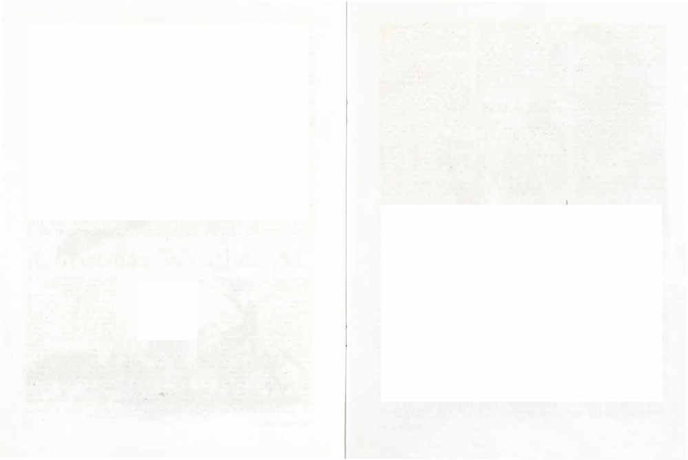 It gets cold too. And there's a good argument by the wife for a new fur coat. At nearly seven thousand feet elevation, the clear, crisp air puts an extra spring to your step that you didn't know you had. Button up your overcoat and take a brisk walk down the snow-banked paths along the rims. It's an exhilarating experience. And in what a settinga veritable Christmas card come to life. Below you lies the mile-deep canyon with its green, gray and red walls, now alternated with bands of pure white. The rims are capped by the great Kaibab forest of pine, pinon and juniper trees, bowed under a blanket of white.