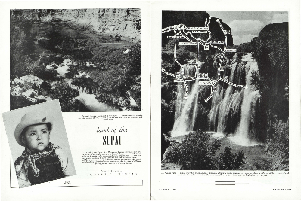 Land of the Supai, tiny Havasupai Indian Reservation in one of the most attractive corners of Grand Canyon ... a doll world where a friendly tribe lives secluded and sequestered ... Red canyon walls reaching toward the blue sky and the white clouds ... within is a symphony of waterfalls of blue-green water, the gentle wind rustling the leaves of the peach trees, the laughter of children ... young ponies running in a green pasture.