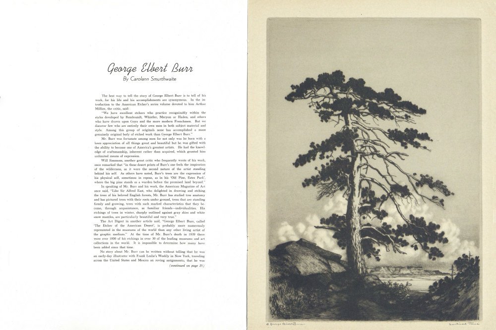 Will Simmons, another great critic who frequently wrote of his work, once remarked that "in these desert prints of Burr's one feels the inspiration of the wilderness, as it were the second nature of the artist standing behind his self. As others have noted, Burr's trees are the expression of his physical self, sometimes in repose, as in his 'Old Pine, Estes Park', where the big pine stands as a warden before the promised land beyond."