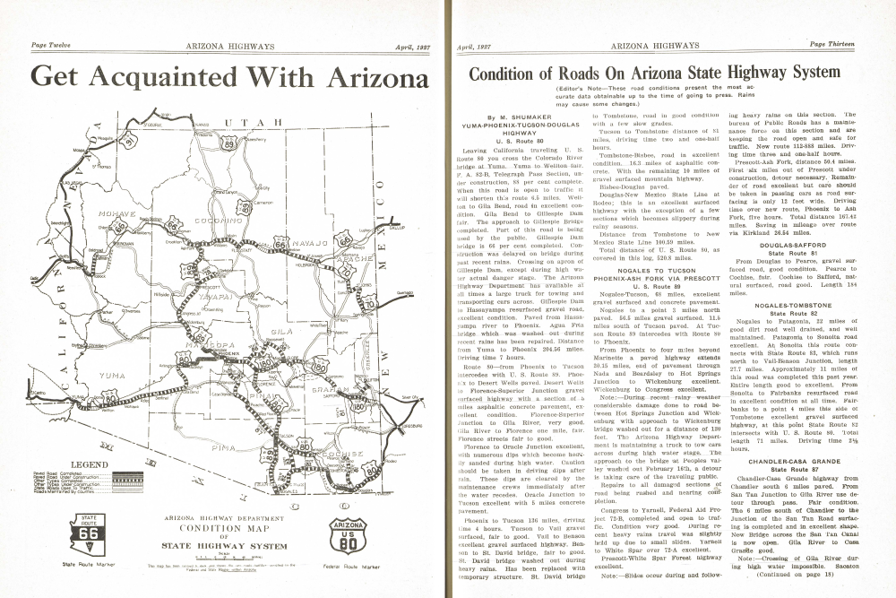 Leaving California traveling U. S. Route 80 you cross the Colorado River bridge at Yuma. Yuma to Wellton fair. F. A. 82-B, Telegraph Pass Section, under construction, 88 per cent complete. When this road is open to traffic it will shorten this route 6.5 miles. Wellton to Gila Bend, road in excellent condition. Gila Bend to Gillespie Dam fair. The approach to Gillespie Bridge completed. Part of this road is being used by the public. Gillespie Dam bridge is 66 per cent completed. Construction was delayed on bridge during past recent rains. Crossing on apron of Gillespie Dam, except during high water actual danger stage. The Arizona Highway Department has available at all times a large truck for towing and transporting cars across. Gillespie Dam to Hassayampa resurfaced gravel road, excellent condition. Paved from Hassayampa river to Phoenix. Agua Fria bridge which was washed out during recent rains has been repaired. Distance from Yuma to Phoenix 204.56 miles. Driving time 7 hours.