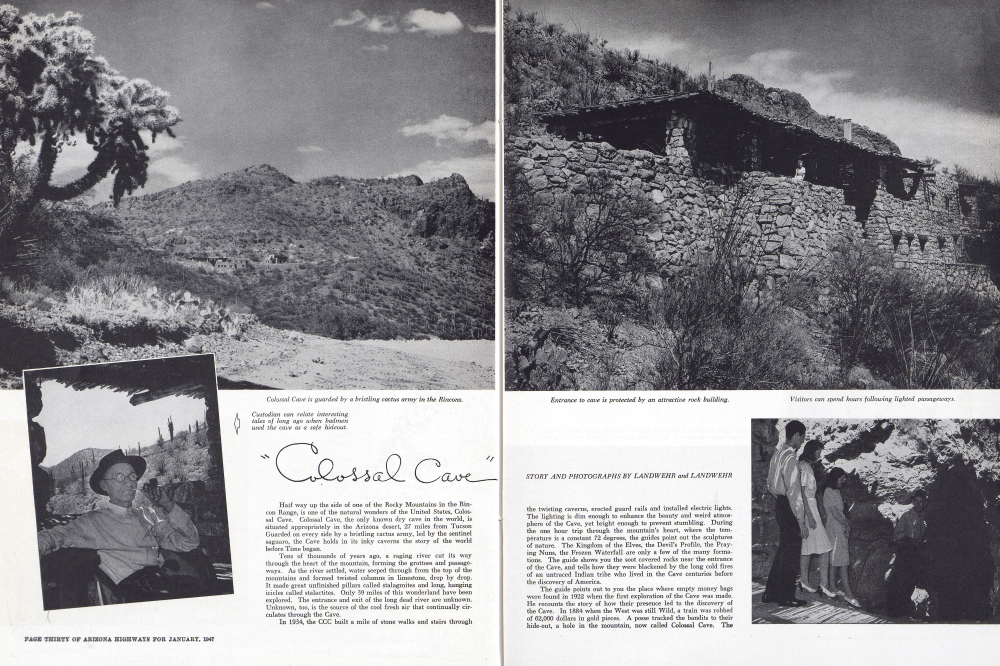 Custodian can relate interesting tales of long ago when badmen used the cave as a safe hideout. Half way up the side of one of the Rocky Mountains in the Rincon Range, is one of the natural wonders of the United States, Colossal Cave. Colossal Cave, the only known dry cave in the world, is situated appropriately in the Arizona desert, 27 miles from Tucson Guarded on every side by a bristling cactus army, led by the sentinel saguaro, the Cave holds in its inky caverns the story of the world before Time began.
