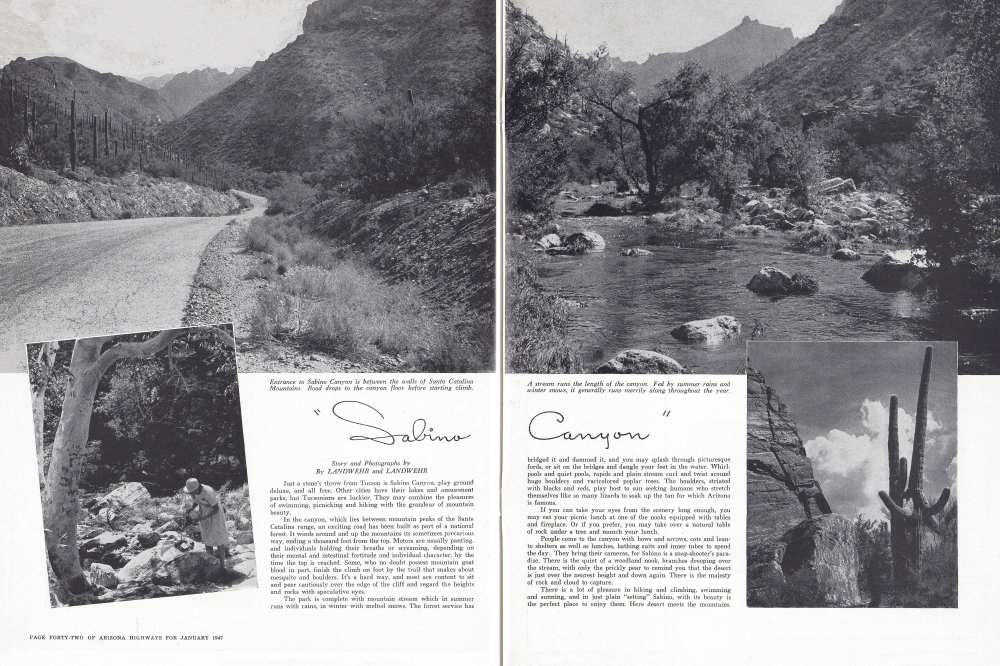 Story and Photographs by By LANDWEHR and LANDWEHR Just a stone's throw from Tucson is Sabino Canyon, play ground deluxe, and all free. Other cities have their lakes and amusement parks, but Tucsonians are luckier. They may combine the pleasures of swimming, picnicking and hiking with the grandeur of mountain beauty.