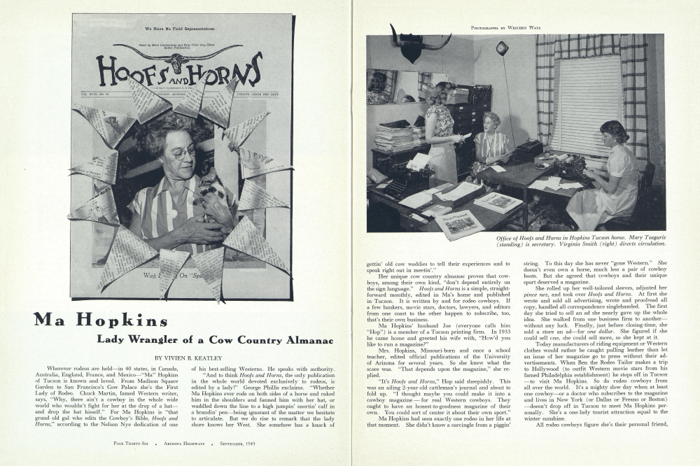 Wherever rodeos are held in 40 states, in Canada, Australia, England, France, and Mexico “Ma” Hopkins of Tucson is known and loved. From Madison Square Garden to San Francisco's Cow Palace she's the First Lady of Rodeo. Chuck Martin, famed Western writer, says, “Why, there ain't a cowboy in the whole wide world who wouldn't fight for her at the drop of a hatand drop the hat hisself.” For Ma Hopkins is “that grand old gal who edits the Cowboy's Bible, Hoofs and Horns,” according to the Nelson Nye dedication of one of his best-selling Westerns. He speaks with authority. “And to think Hoofs and Horns, the only publication in the whole world devoted exclusively to rodeos, is edited by a lady!” George Phillis exclaims. “Whether Ma Hopkins ever rode on both sides of a horse and raked him in the shoulders and fanned him with her hat, or waddled down the line to a high jumpin' snortin' calf in a brandin' pen-being ignorant of the matter we hesitate to articulate. But we do rise to remark that the lady shore knows her West. She somehow has a knack of of his best-selling Westerns. He speaks with authority. “And to think Hoofs and Horns, the only publication in the whole world devoted exclusively to rodeos, is edited by a lady!” George Phillis exclaims. “Whether Ma Hopkins ever rode on both sides of a horse and raked him in the shoulders and fanned him with her hat, or waddled down the line to a high jumpin' snortin' calf in a brandin' pen-being ignorant of the matter we hesitate to articulate. But we do rise to remark that the lady shore knows her West. She somehow has a knack of