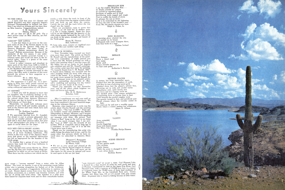 May I compliment you and your staff on the November issue of ARIZONA HIGHWAYS. We have long considered it the most beautiful magazine in our reference library. However, what inspired me to write was the article about Charles Russell and the painting in the center "The Last of 5000." Years ago, my brothers owned and published the Helena Independent in Helena, Montana, and I became familiar with Russell's paintings while spending my summers with them. His picture "Last Chance or Bust" hung on the wall in our home when I was much younger than I am now. But "Last of 5000" was the favorite of my brother, Will A. Campbell, and as long ago as I remember, he had a copy of it in his den. I have never seen it since. Thank you for remembering this artist who really brings the plains back to me and for the many other fine pictures which we have enjoyed since we subscribed to ARIZONA HIGHWAYS. Margaret C. Rasmussen Latin American Village El Monte, Calif.