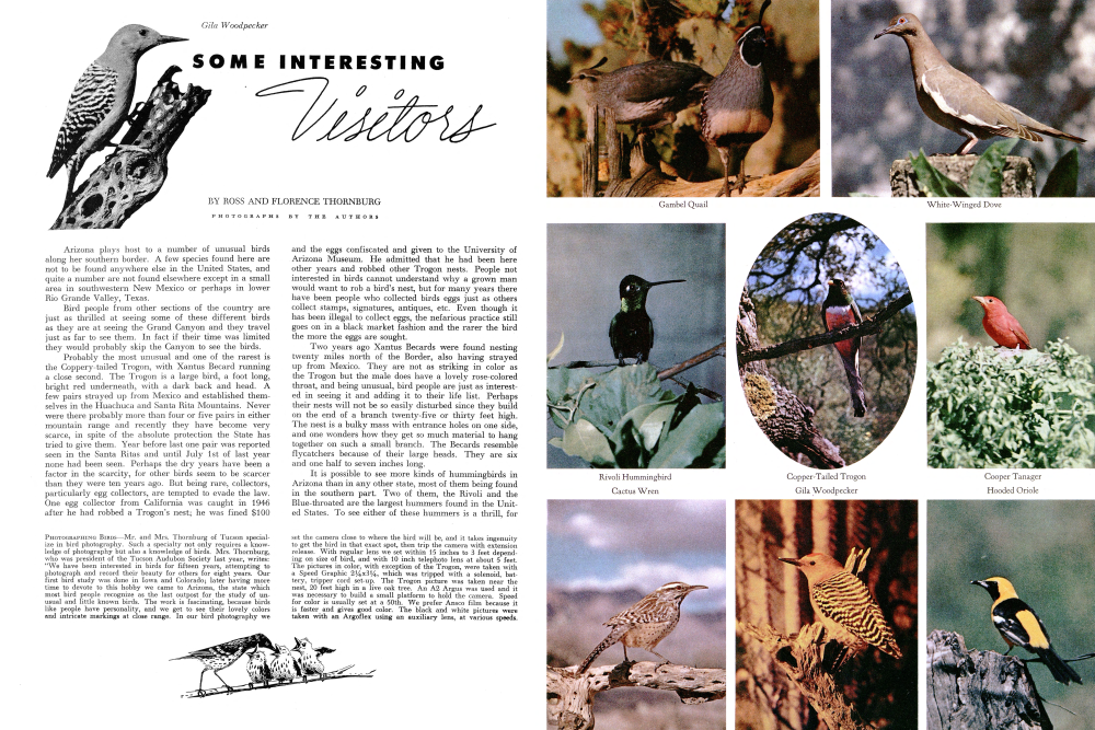 It is possible to see more kinds of hummingbirds in Arizona than in any other state, most of them being found in the southern part. Two of them, the Rivoli and the Blue-throated are the largest hummers found in the United States. To see either of these hummers is a thrill, for PHOTOGRAPHING BIRDS Mr. and Mrs. Thornburg of Tucson specialize in bird photography. Such a specialty not only requires a knowledge of photography but also a knowledge of birds. Mrs. Thornburg, who was president of the Tucson Audubon Society last year, writes: “We have been interested in birds for fifteen years, attempting to photograph and record their beauty for others for eight years. Our first bird study was done in Iowa and Colorado; later having more time to devote to this hobby we came to Arizona, the state which most bird people recognize as the last outpost for the study of unusual and little known birds. The work is fascinating, because birds like people have personality, and we get to see their lovely colors and intricate markings at close range. In our bird photography we set the camera close to where the bird will be, and it takes ingenuity to get the bird in that exact spot, then trip the camera with extension release. With regular lens we set within 15 inches to 3 feet depending on size of bird, and with 10 inch telephoto lens at about 5 feet. The pictures in color, with exception of the Trogon, were taken with a Speed Graphic 214x314, which was tripped with a solenoid, battery, tripper cord set-up. The Trogon picture was taken near the nest, 20 feet high in a live oak tree. An A2 Argus was used and it was necessary to build a small platform to hold the camera. Speed for color is usually set at a 50th. We prefer Ansco film because it is faster and gives good color. The black and white pictures were taken with an Argoflex using an auxiliary lens, at various speeds.