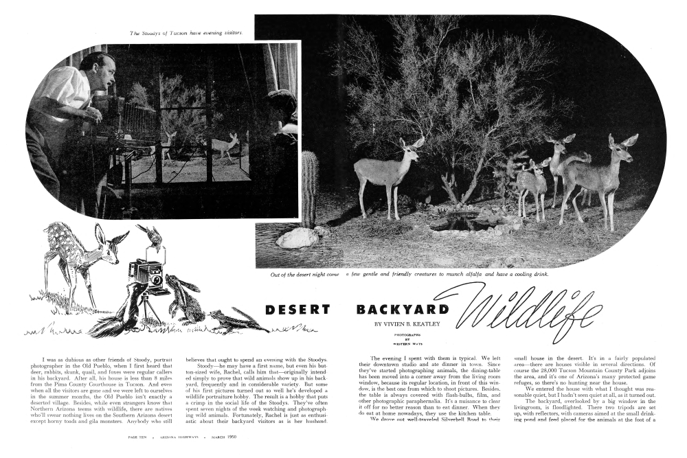 I was as dubious as other friends of Stoody, portrait photographer in the Old Pueblo, when I first heard that deer, rabbits, skunk, quail, and foxes were regular callers in his backyard. After all, his house is less than 8 miles from the Pima County Courthouse in Tucson. And even when all the visitors are gone and we were left to ourselves in the summer months, the Old Pueblo isn't exactly a deserted village. Besides, while even strangers know that Northern Arizona teems with wildlife, there are natives who'll swear nothing lives on the Southern Arizona desert except horny toads and gila monsters. Anybody who stillbelieves that ought to spend an evening with the Stoodys. Stoody he may have a first name, but even his button-sized wife, Rachel, calls him that originally intended simply to prove that wild animals show up in his backyard, frequently and in considerable variety. But some of his first pictures turned out so well he's developed a wildlife portraiture hobby. The result is a hobby that puts a crimp in the social life of the Stoodys. They've often spent seven nights of the week watching and photographing wild animals. Fortunately, Rachel is just as enthusiastic about their backyard visitors as is her husband.