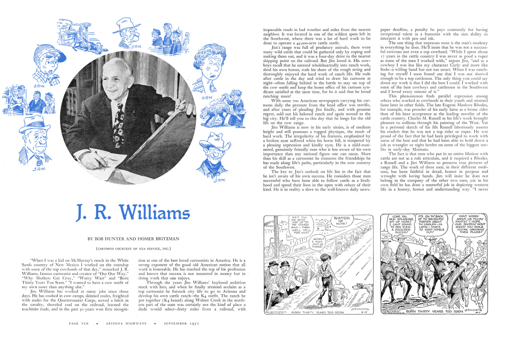 Jim Williams is now in his early sixties, is of medium height and still possesses a rugged physique, the result of hard work. The irregularity of his features, emphasized by a broken nose suffered when his horse fell, is tempered by a pleasing expression and kindly eyes. He is a mild-mannered, genuinely friendly man who is less aware of his own importance than any national figure one can name. More than his skill as a cartoonist he treasures the friendships he has made along life's paths, particularly in the cow country of the Southwest.