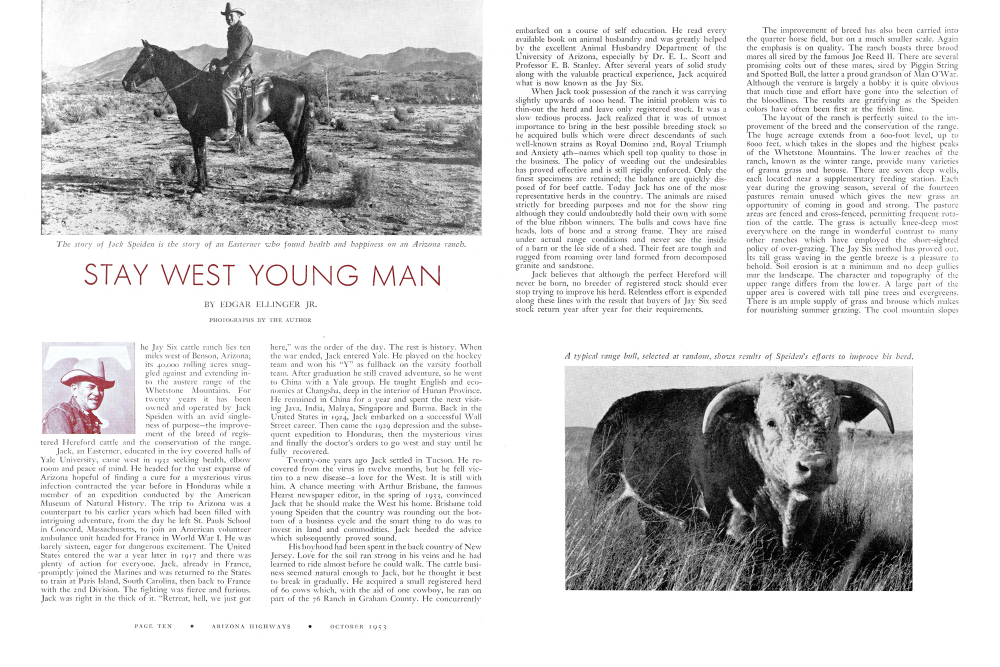 PHOTOGRAPHS BY THE AUTHOR The Jay Six cattle ranch lies ten miles west of Benson, Arizona; its 40,000 rolling acres snuggled against and extending into the austere range of the Whetstone Mountains. For twenty years it has been owned and operated by Jack Speiden with an avid singleness of purpose-the improvement of the breed of registered Hereford cattle and the conservation of the range. Jack, an Easterner, educated in the ivy covered halls of Yale University, came west in 1932 seeking health, elbow room and peace of mind. He headed for the vast expanse of Arizona hopeful of finding a cure for a mysterious virus infection contracted the year before in Honduras while a member of an expedition conducted by the American Museum of Natural History. The trip to Arizona was a counterpart to his earlier years which had been filled with intriguing adventure, from the day he left St. Pauls School in Concord, Massachusetts, to join an American volunteer ambulance unit headed for France in World War I. He was barely sixteen, eager for dangerous excitement. The United States entered the war a year later in 1917 and there was plenty of action for everyone. Jack, already in France, promptly joined the Marines and was returned to the States to train at Paris Island, South Carolina, then back to France with the 2nd Division. The fighting was fierce and furious. Jack was right in the thick of it. "Retreat, hell, we just got here," was the order of the day. The rest is history. When the war ended, Jack entered Yale. He played on the hockey team and won his "Y" as fullback on the varsity football team. After graduation he still craved adventure, so he went to China with a Yale group. He taught English and economics at Changsha, deep in the interior of Hunan Province. He remained in China for a year and spent the next visiting Java, India, Malaya, Singapore and Burma. Back in the United States in 1924, Jack embarked on a successful Wall Street career. Then came the 1929 depression and the subsequent expedition to Honduras; then the mysterious virus and finally the doctor's orders to go west and stay until he fully recovered. Twenty-one years ago Jack settled in Tucson. He recovered from the virus in twelve months, but he fell victim to a new disease-a love for the West. It is still with him. A chance meeting with Arthur Brisbane, the famous Hearst newspaper editor, in the spring of 1933, convinced Jack that he should make the West his home. Brisbane told young Speiden that the country was rounding out the bottom of a business cycle and the smart thing to do was to invest in land and commodities. Jack heeded the advice which subsequently proved sound. His boyhood had been spent in the back country of New Jersey. Love for the soil ran strong in his veins and he had learned to ride almost before he could walk. The cattle business seemed natural enough to Jack, but he thought it best to break in gradually. He acquired a small registered herd of 60 cows which, with the aid of one cowboy, he ran on part of the 76 Ranch in Graham. County. He concurrently embarked on a course of self education. He read every available book on animal husbandry and was greatly helped by the excellent Animal Husbandry Department of the University of Arizona, especially by Dr. E. L. Scott and Professor E. B. Stanley. After several years of solid study along with the valuable practical experience, Jack acquired what is now known as the Jay Six.