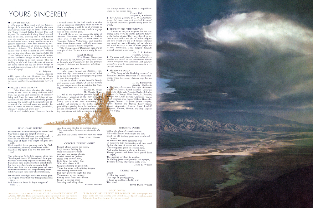 A natural beauty in this land which is timeless and an occasional meditative study of some of God's hourglasses would do us all wonders by relieving some of the anxiety which is a symptom of this frenétic pace. I would like to see you expand the scope of ARIZONA HIGHWAYS frequently to include other areas of the West. A color series on Yosemite, Rainier, Yellowstone, and countless other lesser known areas could add even more to what is already a unique magazine. "The Delicate Arch," December, 1952, was an example of this. To me it was a study in eternity.Joseph H. Ryder West Haven, Connecticut