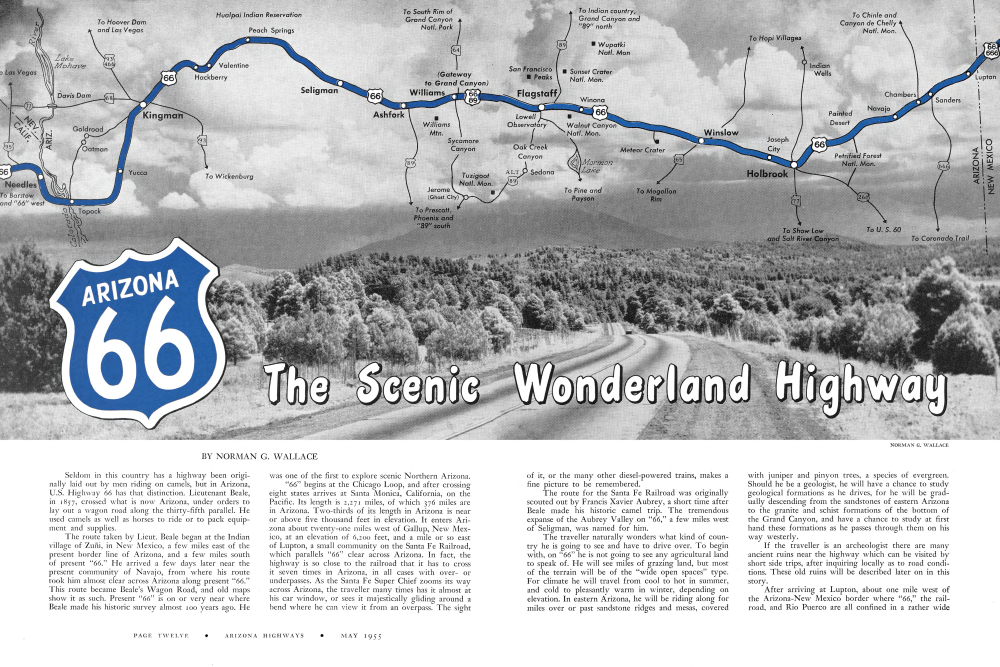Seldom in this country has a highway been originally laid out by men riding on camels, but in Arizona, U.S. Highway 66 has that distinction. Lieutenant Beale, in 1857, crossed what is now Arizona, under orders to lay out a wagon road along the thirty-fifth parallel. He used camels as well as horses to ride or to pack equipment and supplies.