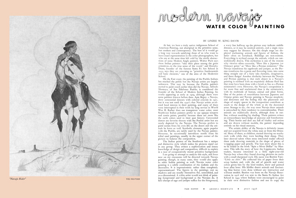 Andy Tsihnahjinnie, one of the "Big Five" painters, was born near Chinle, Arizona, around 1912. His early drawings, done as a small boy, were of the sheep he was herding, drawn on nearby rocks. Later he went to boarding school at Fort Apache and then to Santa Fe Indian Art School. Like the other "Big Five," he was fortunate enough to be under the wise tutelage of Dorothy Dunn who made no attempt to mould his style, but merely to familiarize him with modern art materials. During the War he served with the Fifth Air Force in the South Pacific, and in the Navajo Signal Corps. Tsihnahjinnie is distinct in style from the other "Big Five" and the modernists would claim him for their own. He is extremely original and the follower of no tradition. His color schemes are unheard of, but fascinating, his women bizarre and very Mongolian in type, and his plant forms unrecognizable. Although he has none of the delicacy of line that charms one with a Begay, still there is a dramatic mood and distinctive individuality about his paintings that definitely put them in the highest ranks. ARIZONA HIGHWAYS (Feb. 1950) has printed some splendid reproductions of his work in color. In one of these, a gaunt emaciated boy on a turquoise colored horse is running from the approaching night. The boy rides as though he were pursued by a demon, leaning forward in the saddle, with his black hair flying. In the middle distance, indicated by a slightly lighter violet hue than the purpleblack foreground, another boy on a beige-apricot horse is urging on three small deer to safety. The far distanceis represented by tall rust-colored buttes (or “monuments”) with variegated colored horizontal bands simulating strata, and long wiggly octopus-like arms extending down from them, to indicate slopes of scree. Navajo fear the dark and there is a fearful mood about the whole picture. In another one, called the “Stick Game,” three Navajo women are grouped in a triangle against a “bois rose” background, with a ribbon of soft green conventionalized plant-form behind them. Each small area in the painting, like the women's coal black hair, is a design form in itself. Like Gerald Nailor, Tsihnahjinnie divides the women's full skirts into small rhythmic fan-like shapes, each an element in the design and each a subtly different hue of color from the next one. In this picture, these small shapes graduate in color from pure violet down through eight intermediate shades to an increasingly neutralized hue which ties in with the soft rose background. One of his loveliest color schemes depicts a race between two young women on madly-galloping ponies. In contrast to the horizontal action of the speeding horses is a motionless figure, the referee, mounted on a steed which looks more Arab than Indian pony. The only background and foreground are suggested by two irregular horizontal lines broken by some fan-shaped bunches of grass. The background is a soft chocolate and the horses and girls' garments are varying shades of greygreen, nile green, chartreuse, apricot and chestnut. The manes and tails of the ponies are variegated shades of the colors used throughout the rest of the picture. Tsihnahjinnie's favorite color scheme is, however, composed of aqua horses, violet skies and terracotta buttes. Horses are a joy to him and Dorothy Dunn describes some small watercolors of horses he recently exhibited as “consummately painted-original, virile and untamed-an expression of really great talent.