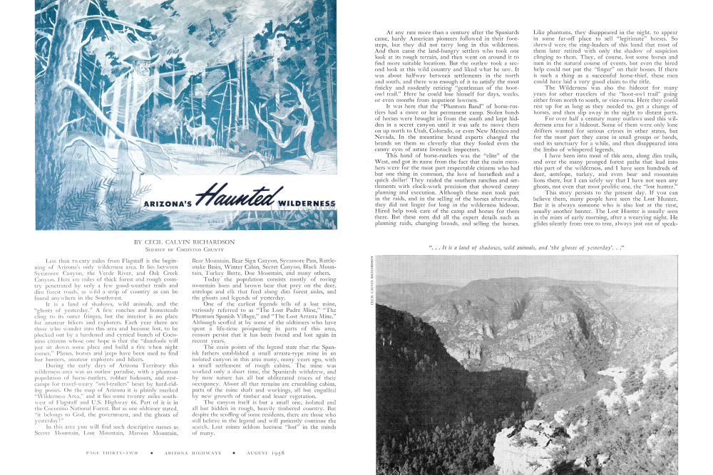 BY CECIL CALVIN RICHARDSON SHERIFF OF COCONINO COUNTY Less than twenty miles from Flagstaff is the beginning of Arizona's only wilderness area. It lies between Sycamore Canyon, the Verde River, and Oak Creek Canyon. Here are miles of thick forest and rough country penetrated by only a few good-weather trails and dim forest roads, as wild a strip of country as can be found anywhere in the Southwest.