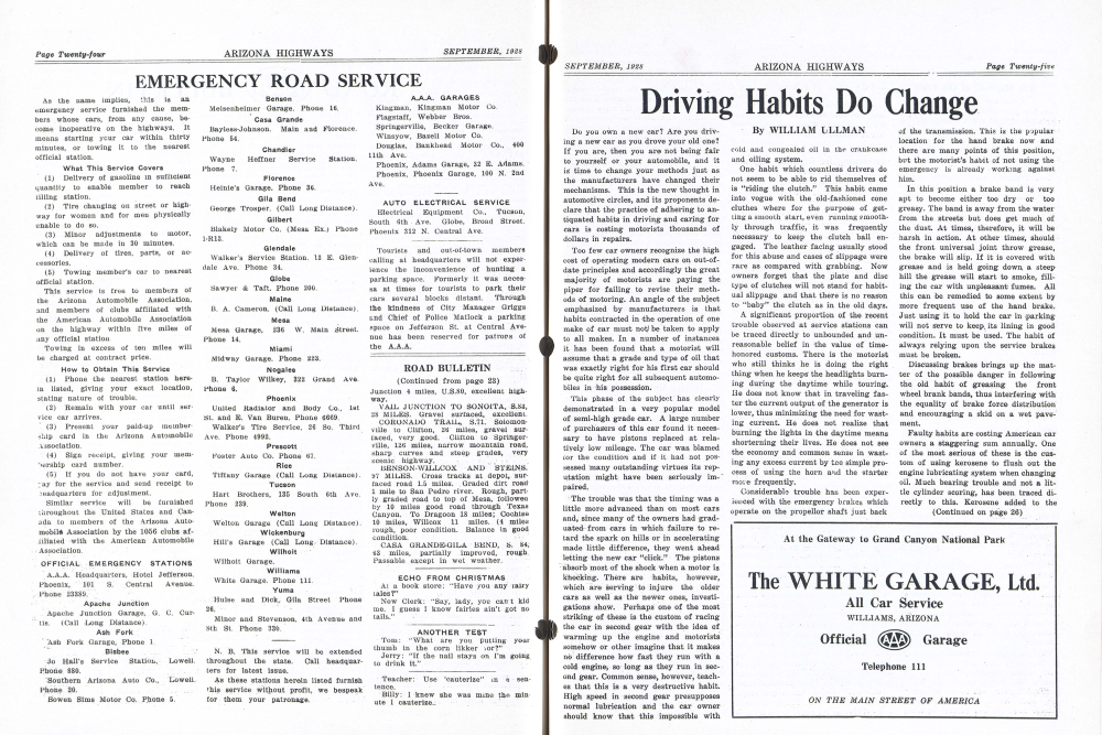 A.A.A. Headquarters, Hotel Jefferson, Phoenix, 101 S. Central Avenue. Phone 23389. Apache Junction Garage, G. C. Curtis. (Call Long Distance).