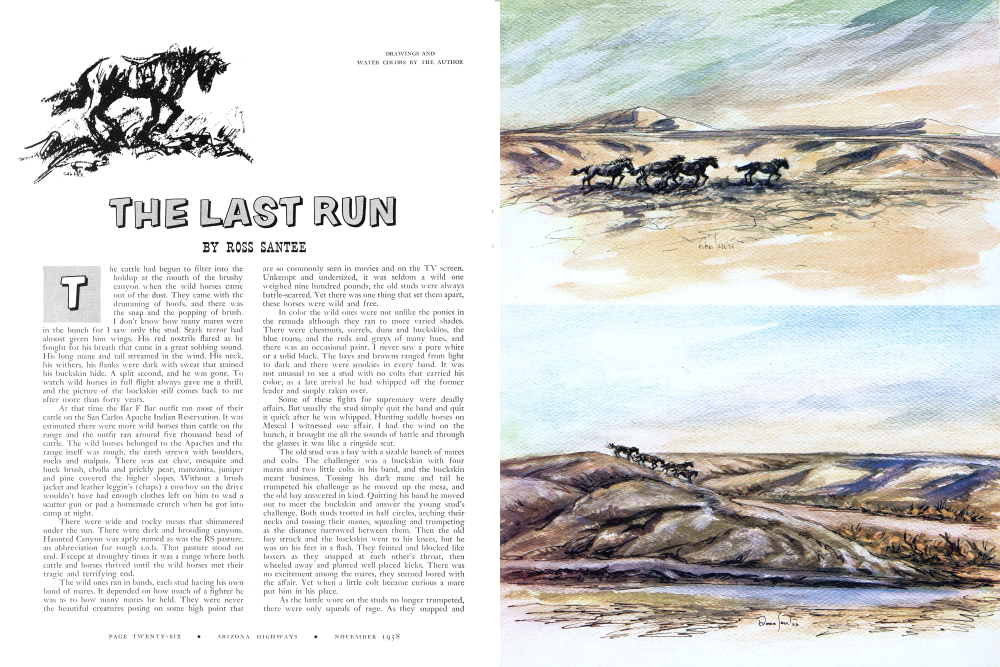 To me the wild horses were as much a part of that rough and rugged land as the Apaches. Many old cowboy friends who have long since made their crossing were a part of that range, too. Its wide and rocky mesas still shimmer under the sun. Nor have its dark and brooding canyons changed, yet something has gone from the land. Nor will it ever be the same again to anyone who knew that range when the wild horses were a part of it, and they were wild and free.