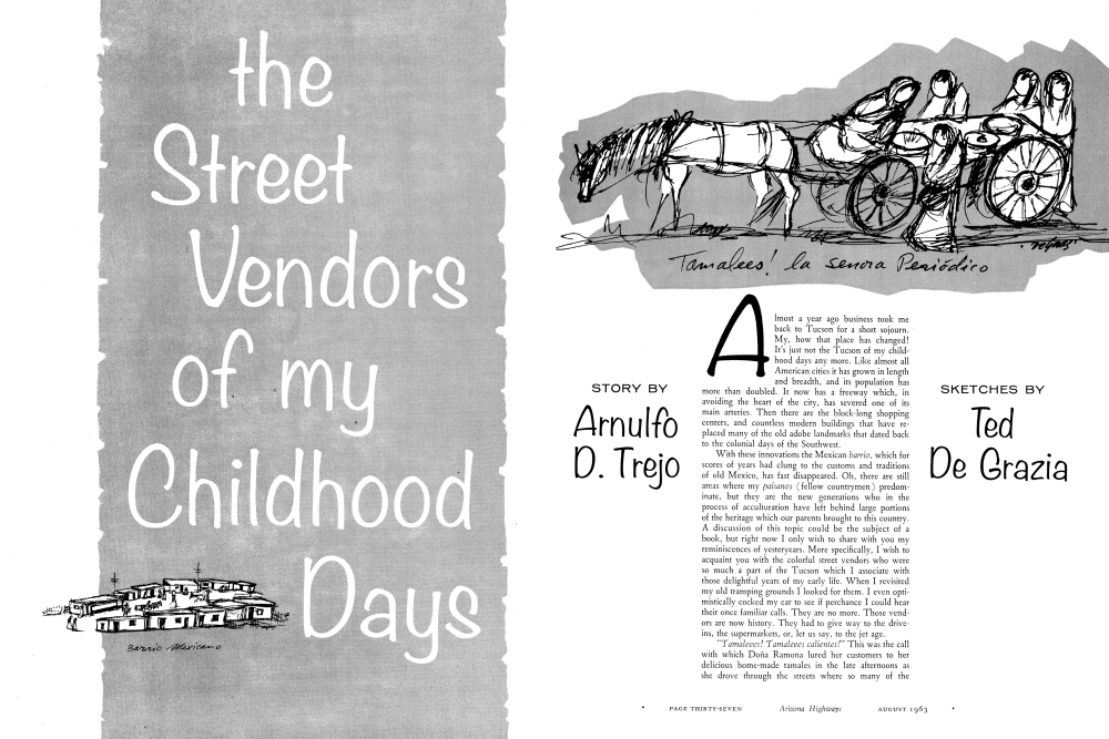 Almost a year ago business took me back to Tucson for a short sojourn. My, how that place has changed! It's just not the Tucson of my child hood days any more. Like almost all American cities it has grown in length and breadth, and its population has more than doubled. It now has a freeway which, in avoiding the heart of the city, has severed one of its main arteries. Then there are the block-long shopping centers, and countless modern buildings that have re placed many of the old adobe landmarks that dated back to the colonial days of the Southwest. With these innovations the Mexican barrio, which for scores of years had clung to the customs and traditions of old Mexico, has fast. disappeared. Oh, there are still areas where my paisanos (fellow countrymen) predom inate, but they are the new generations who in the process of acculturation have left behind large portions of the heritage which our parents brought to this country. A discussion of this topic could be the subject of a book, but right now I only wish to share with you my reminiscences of yesteryears. More specifically, I wish to acquaint you with the colorful street vendors who were so much a part of the Tucson which I associate with those delightful years of my early life. When I revisited my old tramping grounds. I looked for them. I even opti mistically cocked my ear to see if perchance. I could hear theit once familiar calls. They are no more. Those vend ors are now history. They had to give way to the drive ins, the supermarkets, or, let us say, to the jet age: "Tamaleees! Tamaleges calientes!" This was the call with which Doña Ramona lured her customers to her delicious home-made tamales in the late afternoons as she drove through the streets where so many of the