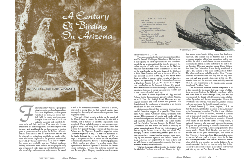 For over a century Arizona's geographic situation on the northern border of the Mexican highlands, and its great variety of life zones, has been a fruitful field for study and pleasure. People from far and near have ardently observed and recorded Arizona birds and their activities. First came the doctors attached to the exploring parties, then the surgeons with the army as it established the far flung system of frontier posts to protect the settlers against the Indians. After the Indians were subdued and the settlers were able to care for themselves, professional ornithologists made collections which were displayed in the principal museums of the world. By the middle twenties check lists and appealing books were available, and the National Audubon Society had won its battle and was encouraging the study and protection of birds. Each era contributed much scientific knowledge and wholesome enjoyment to the casual as well as the more serious watchers. Thousands of people, interested in seeing birds in their natural habitat, have journeyed to Arizona by all manner of transportation from wagons to planes. The early 1850's brought a desire by the people of the United States to connect the west and the east with a railroad, and a number of scientific expeditions were organized. These included groups of men to make topographical maps and bring back information about the country they pushed through. The first of these through Arizona was the Sitgreaves Expedition, organized under Lieutenant Sitgreaves in 1851. It had been customary in the Pacific Railroad Surveys for the Secretary of War to assign a surgeon-naturalist as doctor on the expedition and much of his time was devoted to collecting specimens of birds, reptiles, and plants. He worked under direct supervision of Professor Spencer F. Baird of the Smithsonian Institution, to whom the collected material was sent. In some places this party traveled across Arizona on