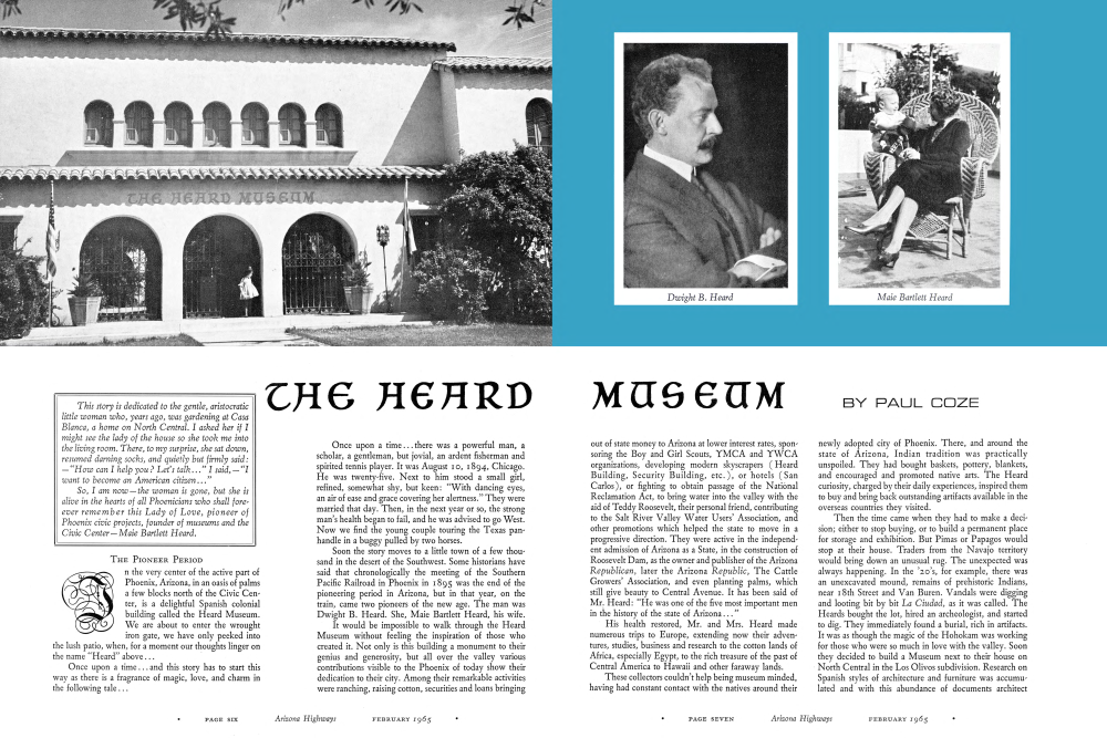 In the very center of the active part of Phoenix, Arizona, in an oasis of palms a few blocks north of the Civic Center, is a delightful Spanish colonial building called the Heard Museum. We are about to enter the wrought iron gate, we have only peeked into the lush patio, when, for a moment our thoughts linger on the name "Heard" above...