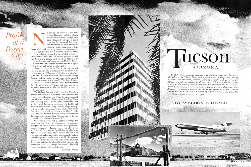 No one knows when the first red-skinned Tucsonians settled in what is now Southern Arizona. It might have been a thousand years ago-it could be two or three thousand. But at any rate, they found the wide, mountain-girt desert basin a good place to live. People still do, and are coming in ever-increasing numbers. The Indians called their community Stjukshon, which has been variously translated to mean “dark spring” or “at the foot of a black hill.” When the Spaniards pushed their New-World Empire northward from Mexico City in the late Seventeenth Century, they established a Catho-lic mission at this little Papago Indian village and in 1769 built a church and walled presidio nearby. Named San Augustin de Tucson, the tiny, isolated pueblo of soldiers and their families was for many years a remote outpost of European civilization in a wild, barbaric land. The fort withstood attacks by the savage Apaches, and the garrison protected the widely scattered ranches and settlers as best it could. The flags of Spain, Mexico, the Confederacy and the United States flew over the little walled town of Tucson, and today the city is still fondly referred to as “The Old Pueblo” in memory of its valiant past.