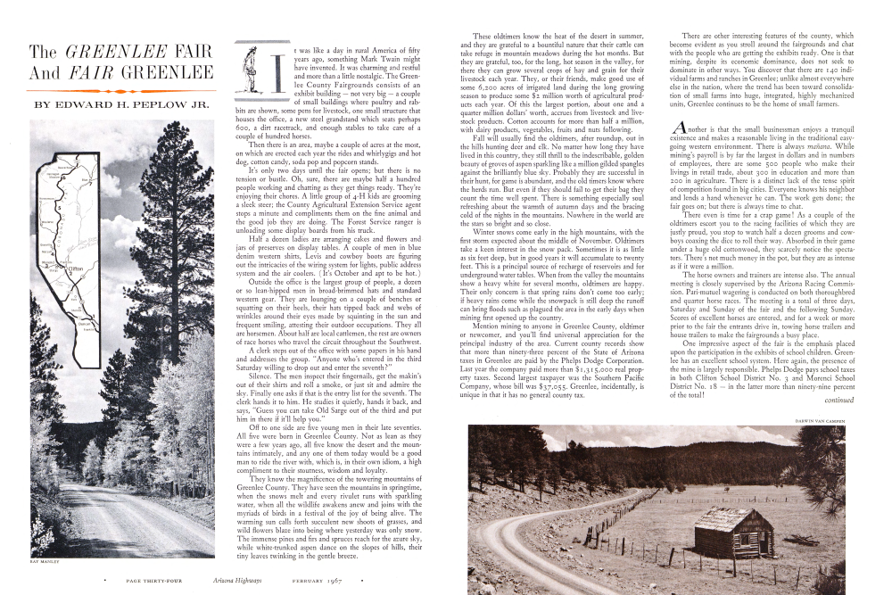 Mention mining to anyone in Greenlee County, oldtimer or newcomer, and you'll find universal appreciation for the principal industry of the area. Current county records show that more than ninety-three percent of the State of Arizona taxes in Greenlee are paid by the Phelps Dodge Corporation. Last year the company paid more than $1,315,000 real proption of small farms into huge, integrated, highly mechanized units, Greenlee continues to be the home of small farmers.