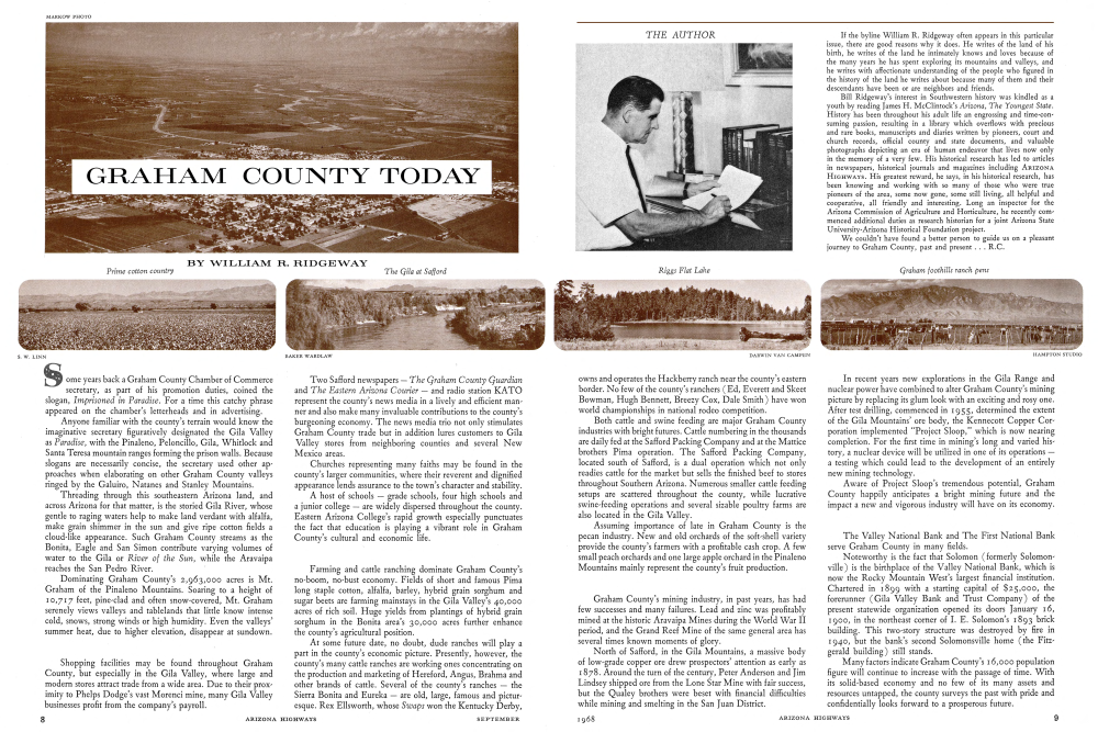 If the byline William R. Ridgeway often appears in this particular issue, there are good reasons why it does. He writes of the land of his birth, he writes of the land he intimately knows and loves because of the many years he has spent exploring its mountains and valleys, and he writes with affectionate understanding of the people who figured in the history of the land he writes about because many of them and their descendants have been or are neighbors and friends. Bill Ridgeway's interest in Southwestern history was kindled as a youth by reading James H. McClintock's Arizona, The Youngest State. History has been throughout his adult life an engrossing and time-consuming passion, resulting in a library which overflows with precious and rare books, manuscripts and diaries written by pioneers, court and church records, official county and state documents, and valuable photographs depicting an era of human endeavor that lives now only in the memory of a very few. His historical research has led to articles in newspapers, historical journals and magazines including ARIZONA HIGHWAYS. His greatest reward, he says, in his historical research, has been knowing and working with so many of those who were true pioneers of the area, some now gone, some still living, all helpful and cooperative, all friendly and interesting. Long an inspector for the Arizona Commission of Agriculture and Horticulture, he recently commenced additional duties as research historian for a joint Arizona State University-Arizona Historical Foundation project. We couldn't have found a better person to guide us on a pleasant journey to Graham County, past and present . . . R.C.