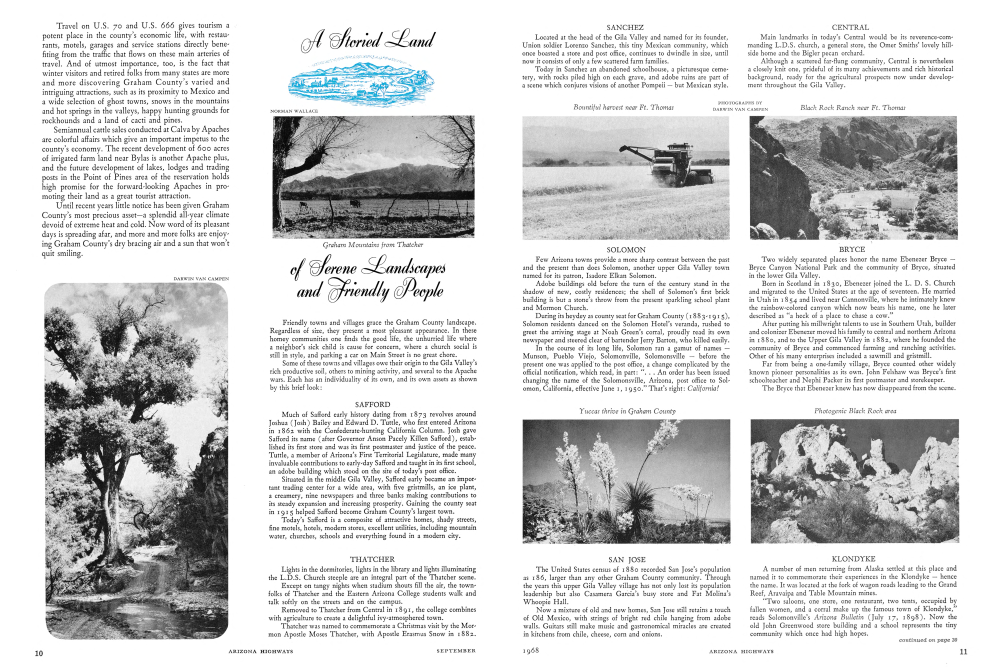 Some of these towns and villages owe their origin to the Gila Valley's rich productive soil, others to mining activity, and several to the Apache wars. Each has an individuality of its own, and its own assets as shown by this brief look: